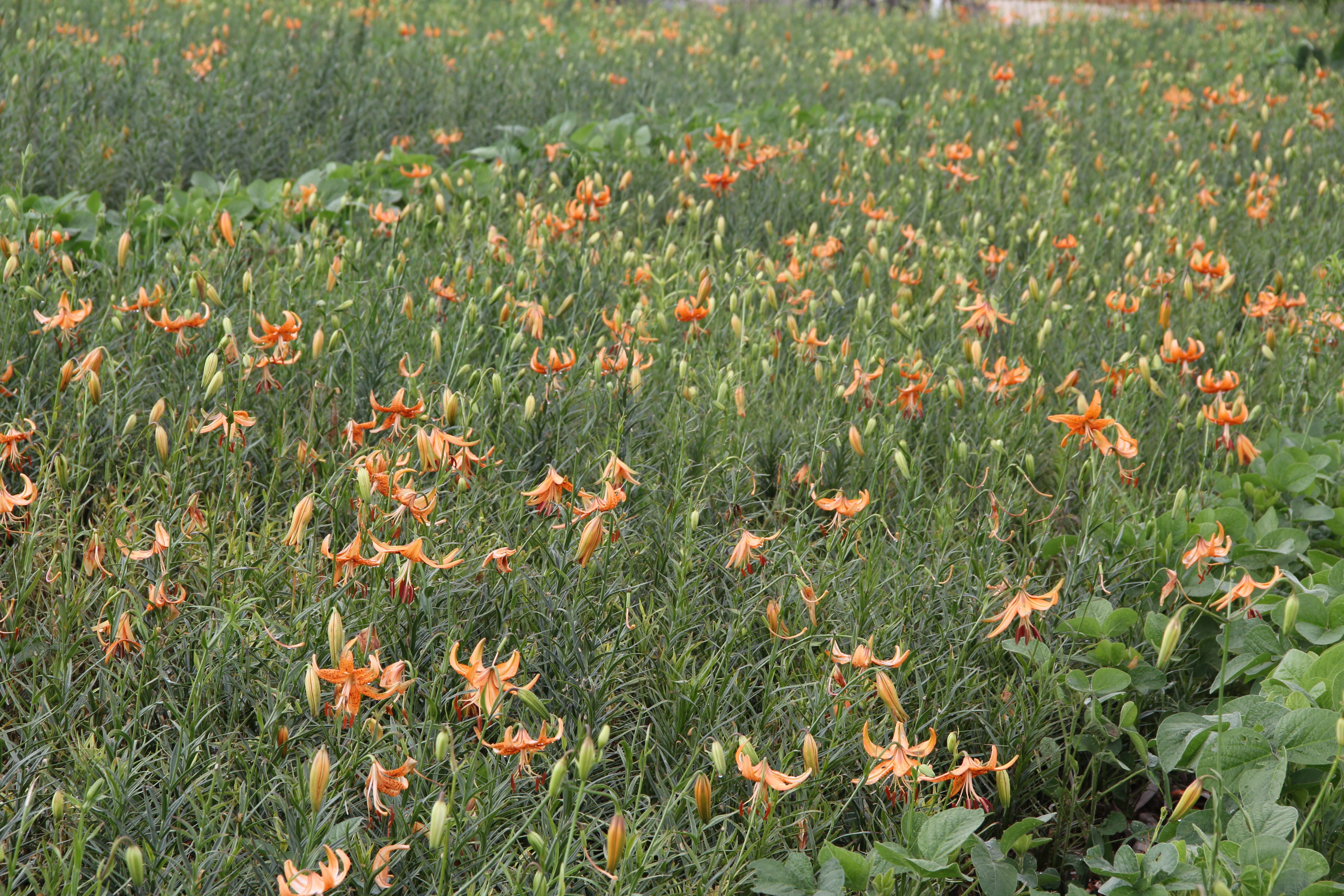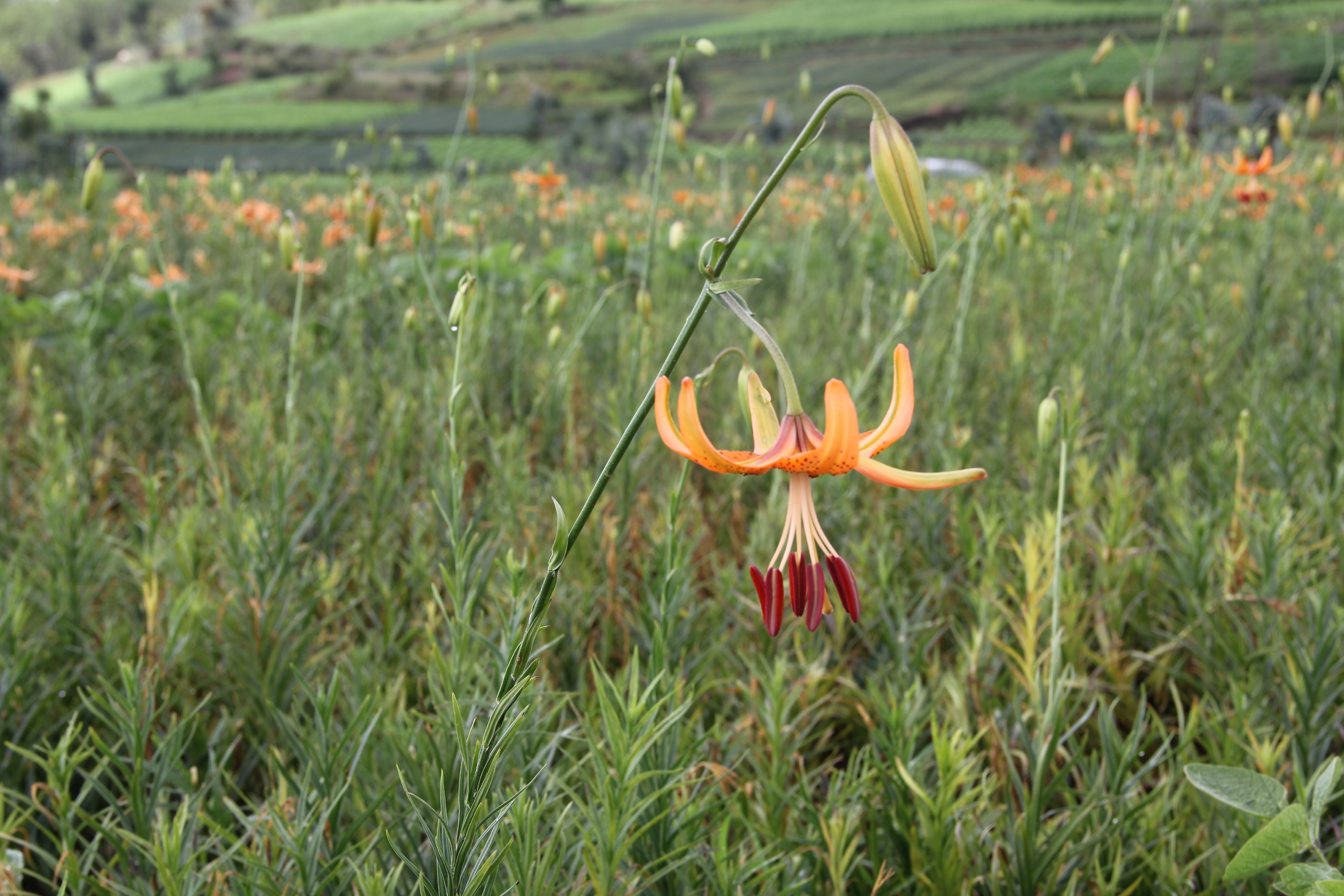 来到藏在山峦里的一片绿野,举目眺望,山岗上和山谷中的田地里,成片的百合花竞相开放,令人眼前一亮,更觉山岗箐谷清新秀丽,一切都是那么的迷人,让人动容,留恋忘返。