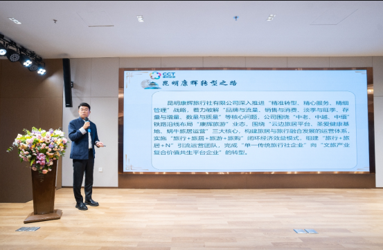 旅行社行业代表康辉旅行社董事长助理刘华平发言中表示,昆明康辉旅行社围绕“云边旅居平台、圣爱健康基地、蜗牛旅居运营”三大核心,构建旅居与旅行融合发展的运营体系,实施“旅行+旅居+旅游+旅购”闭环经济效益模式,组建“旅行+旅居+N”引流运营团队,完成“单一传统旅行社企业”向“文旅产业复合价值共生平台企业”的转型。