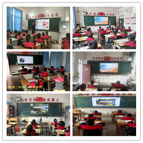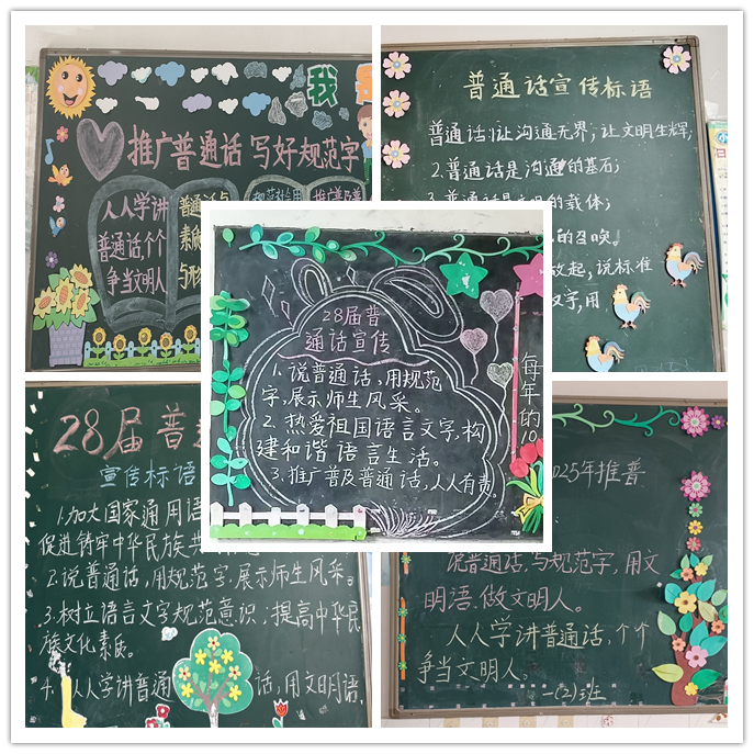 粘贴标语,刊出板报,营造推普氛围。为迎接推普周的到来,校园内全覆盖粘贴推普宣传画和标语,各班级精心刊出图文并茂的推普板报,全面宣传推普知识,形成了“说普通话、写规范字、做文明人”的浓厚推普氛围。宣传活动融合了历届推普文化传承,既是语言规范化的直观呈现示范,又能潜移默化地引导学生树立语言规范意识,是铸牢强国语言基石的重要载体。
