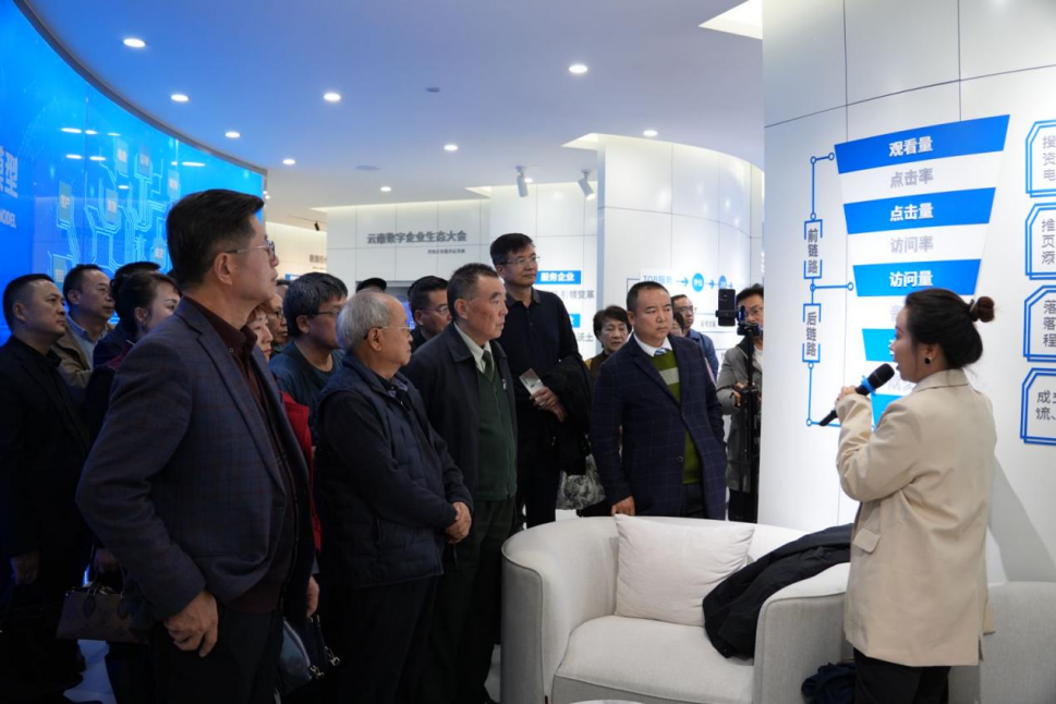 云南省民营企业家协会代表团实地了解企业在企业服务、数字化生态构建等领域的核心布局,通过展厅内的技术展示、业务场景呈现,直观感知企业在民营经济服务领域的创新成果,先后走进办公区、数智企业展厅、腾讯广告营销服务中心三大区域,全方位感知企业的运营生态与服务能力。