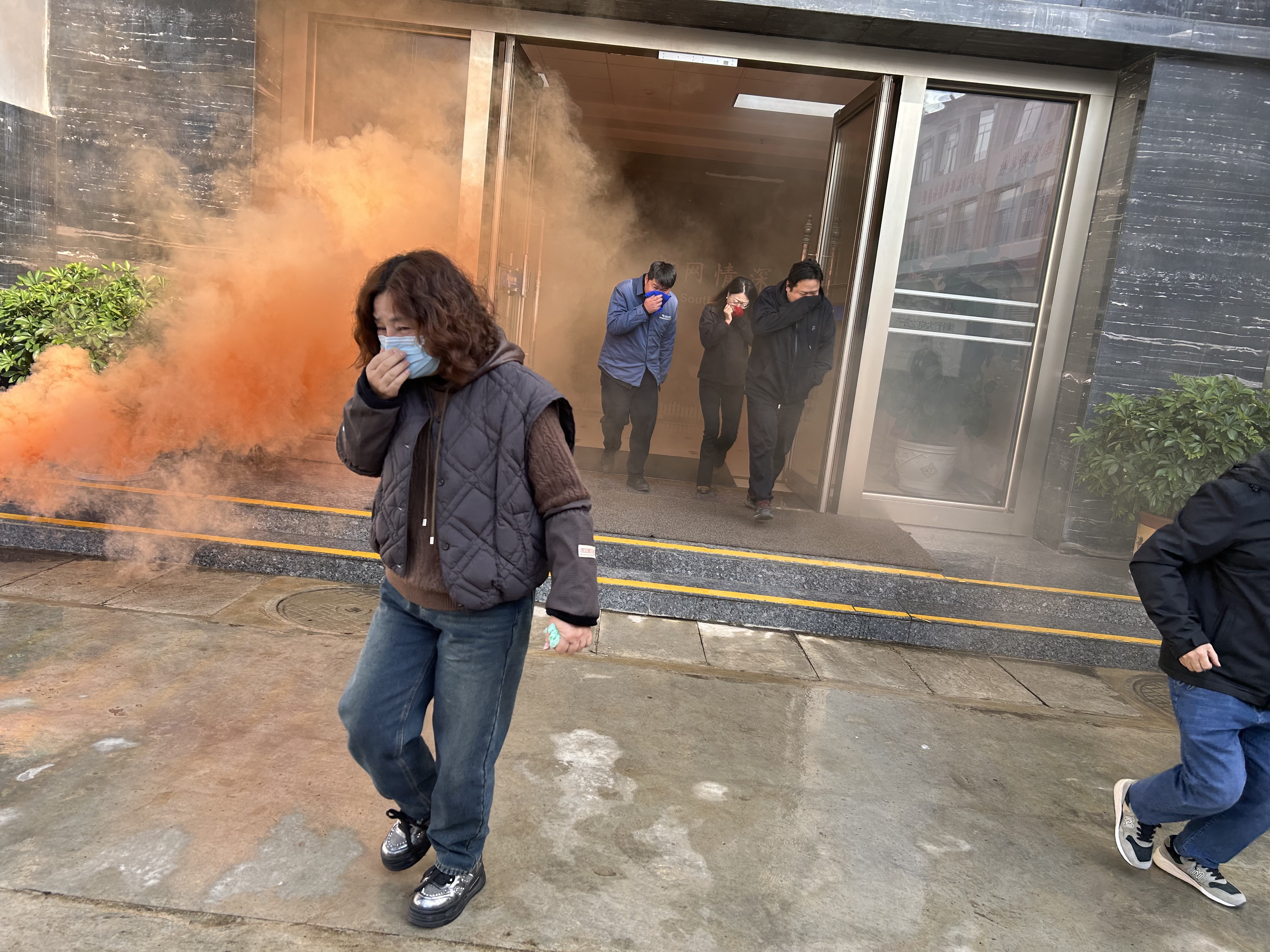 下午16: 0 0办公大楼突然响起火警警报有职工报告7搂会议室发生火灾,消防监控室值班人员立即赶到现场确认火势较大无法扑救后,立即拔打11 9报警电话,同时向单领导报告火灾情况,总指挥立即启动应急预案,义务消防队员身穿消防服手持灭火器第一时间赶到各楼层疏散人群。撤离人员在保安消防员的引导下带着呼吸器,来不及带呼吸器的用毛巾手帕手袖口等捂着鼻子和嘴巴弯着身子有序向消防安全通道撤离到大院内安全地带,警报响起到最后一个人撤离大约16分钟左右时间。