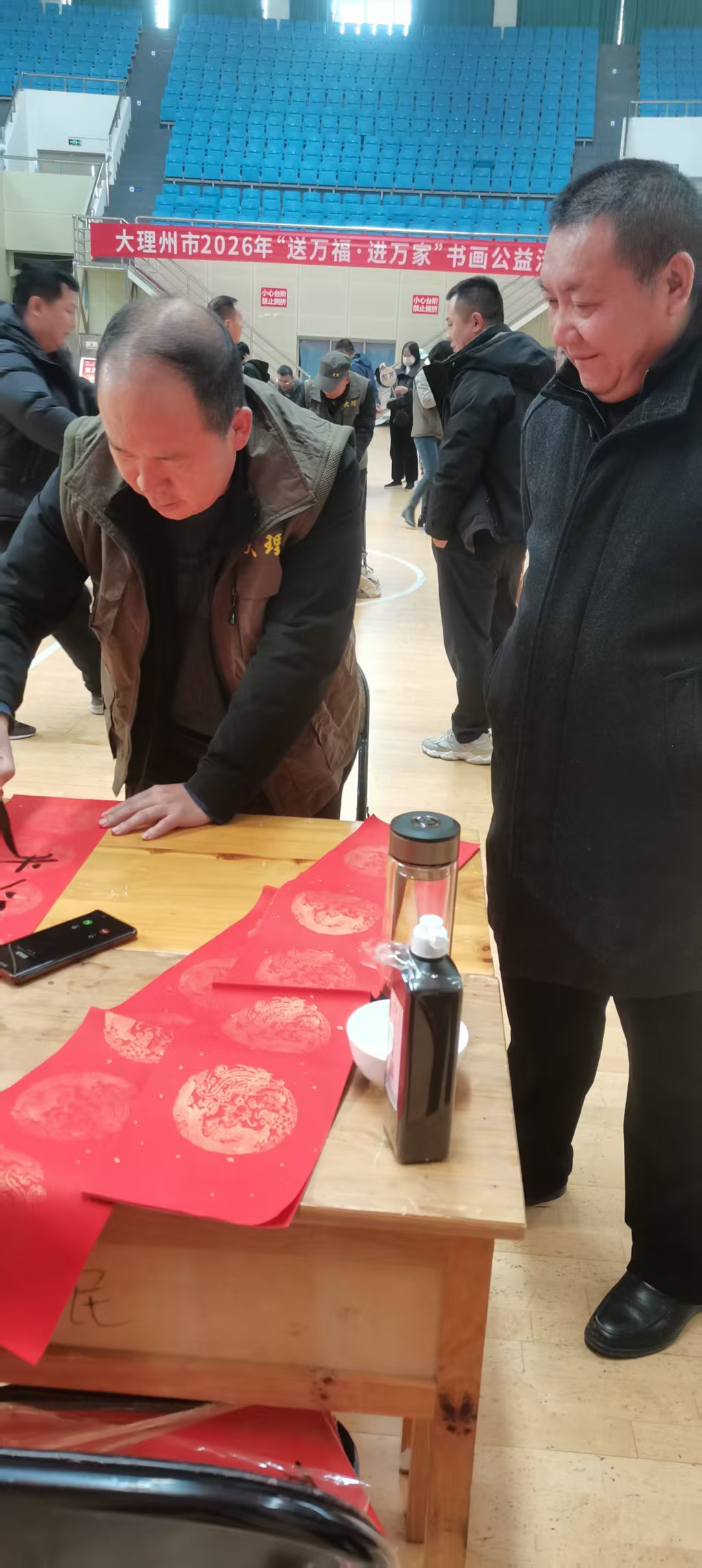 为弘扬中华优秀传统文化,丰富大理民族地区群众精神文化生活,营造欢乐祥和的节日氛围,让广大市民度过一个祥和喜庆、充满文化韵味的 2026 年春节。1月30日下午,由云南省大理州退役军人事务局、大理州总工会、大理州文学艺术界联合会、大理市总工会、大理市文学艺术界联合会联合主办,大理市教育建设投资有限责任公司协办的“年味浓、情意嗳、文化兴”----大理州市2026年“送万福・进万家”书法公益活动在大理全民健身中心室内篮球场圆满落下帷幕。