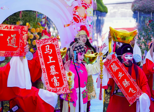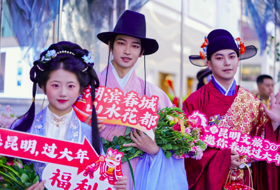 n发布会现场,大型艺术沉浸式立体花雕“观山・观水・观春城”成为吸睛焦点,该花雕以高山杜鹃、云南山茶等50余种乡土花卉植物为主材,通过主题鲜明、造型新颖的艺术表达,生动诠释昆明生态宜居、开放包容的城市气质,成为新春城市景观的点睛之笔。此外,现场还精心筹备了诸多特色互动环节,氛围感拉满:汉服古风少年团为游客赠送新鲜花卉,传递新春祝福;《昆明蓝》歌曲演唱唱响春城的澄澈与浪漫;《四丑闹春・戏变乾坤》财神互动表演及财神巡游轮番上演,为现场游客送上新年福气,让整场发布会既有文化底蕴,又充满节日的热闹气息。