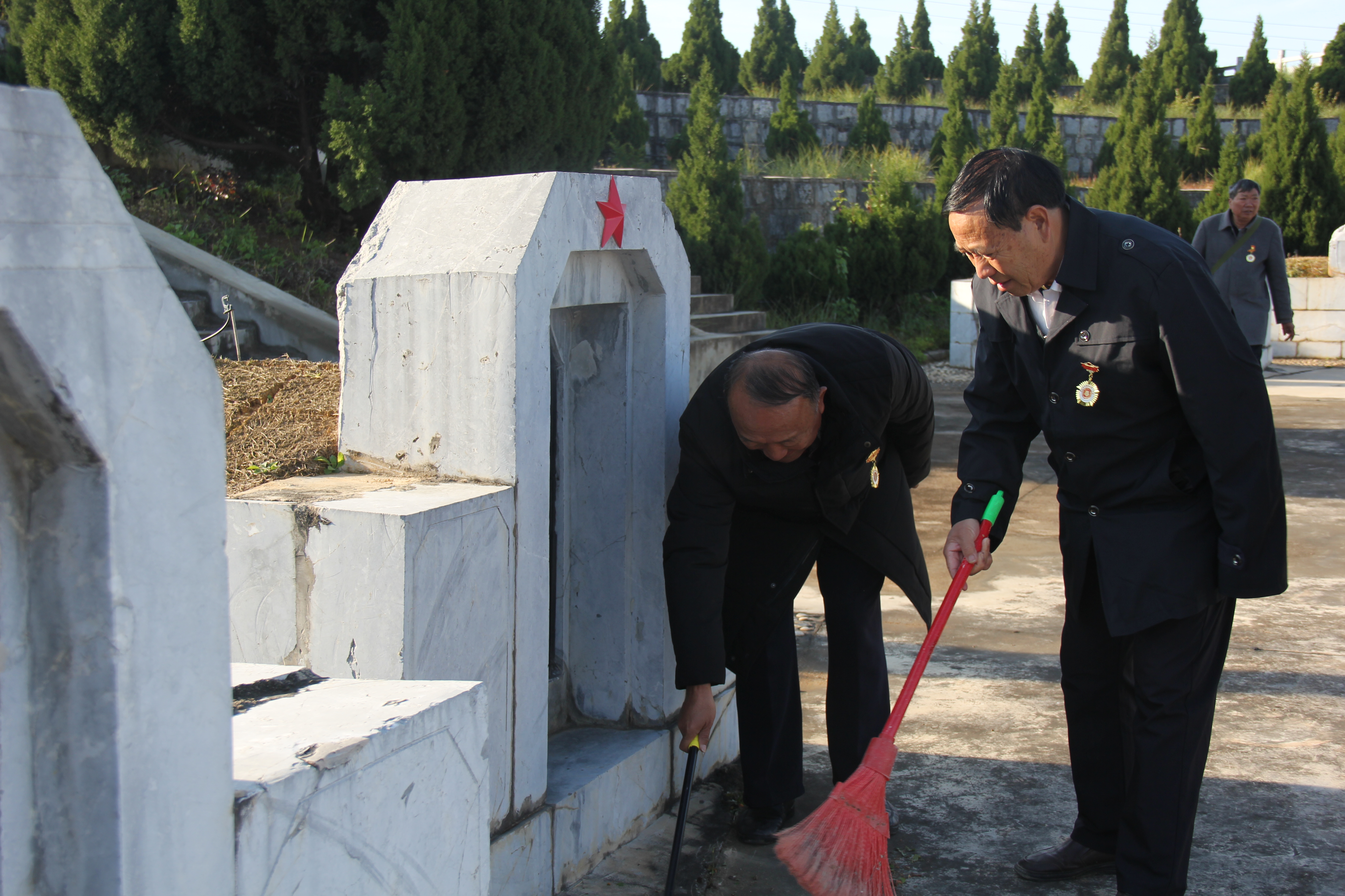 活动当天,阳光和煦,烈士陵园内松柏静立,气氛庄严肃穆。一群身着胸前挂着“祥云县关爱退役军人协会”纪念章的退役军人,有的弯腰清扫着园区广场和墓碑间的落叶尘土,不放过任何一个卫生死角,有的拎着撮箕将垃圾撮走,让烈士陵园的墓碑和设施在阳光下愈发清晰。
