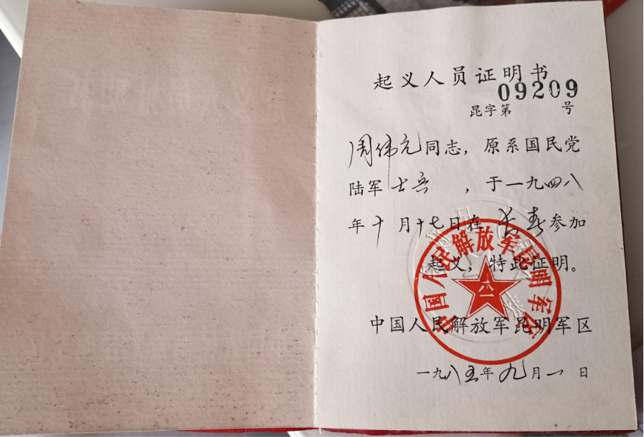 周伟元,男,1926年出生在祥云县米甸镇三家朝阳地村,1950年6月加入中国共产党组织,志愿军老战士。