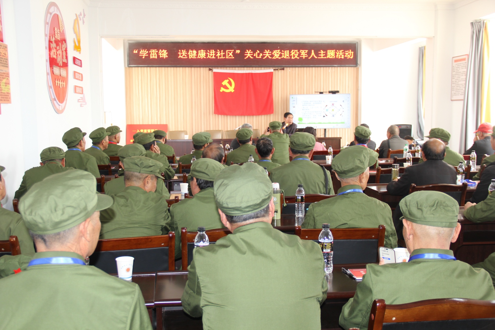 社区活动现场气氛热烈且温馨,闻讯而来的老兵聚集在会议室,聆听健康知识讲座,进行健康体检和感受推拿等治疗。