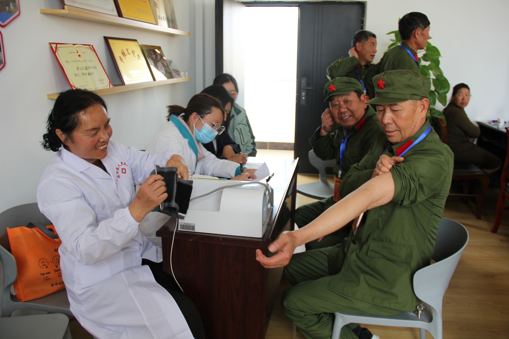活动当天,来自梧桐珍所的医务人员与退役军人志愿者们迅速投入到服务工作中。医务人员耐心细致地为老兵量血压、测心率等体检,将温暖与关怀送到老兵们的身边。