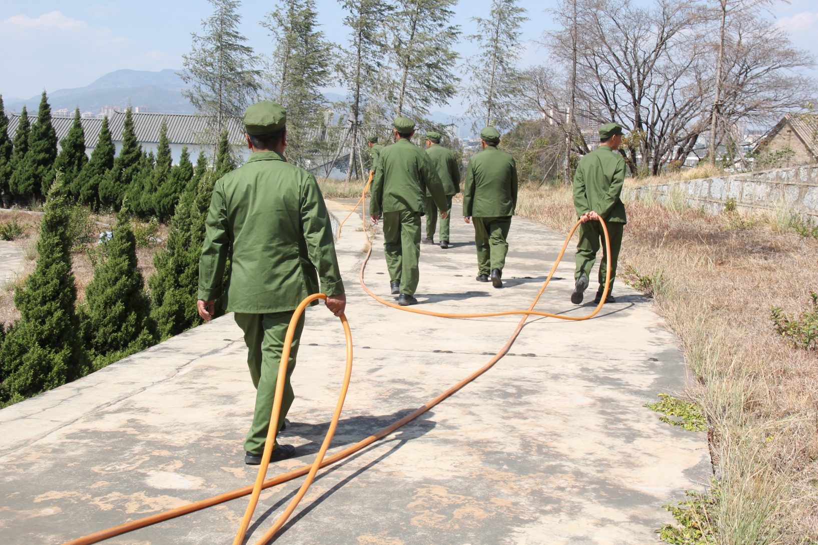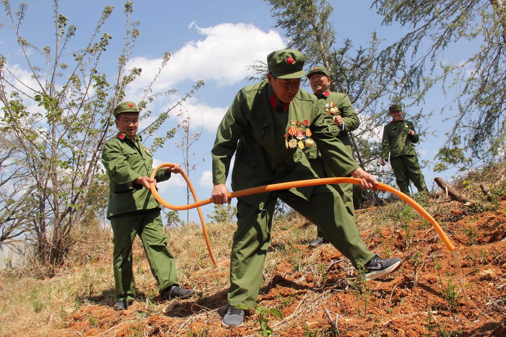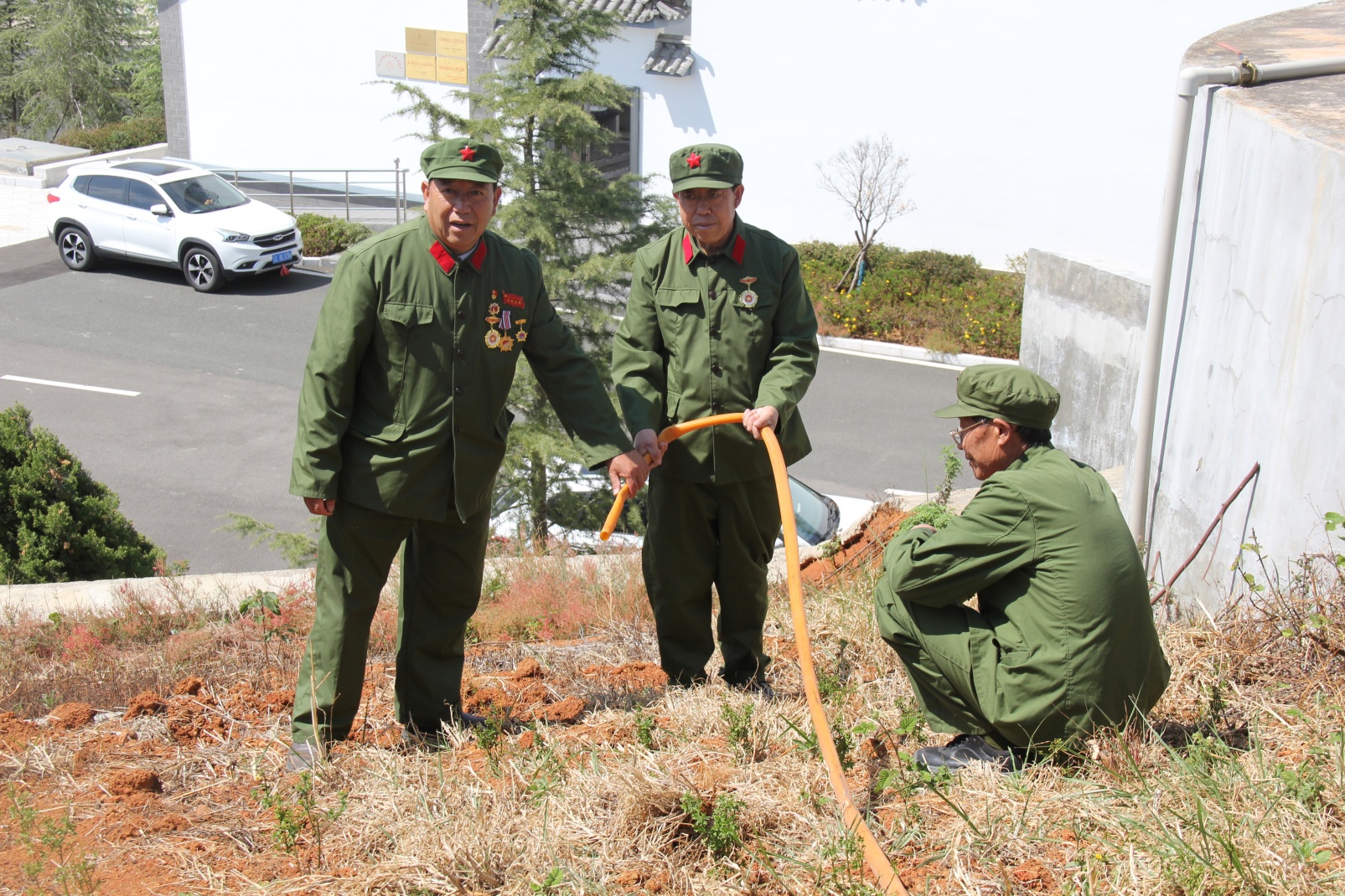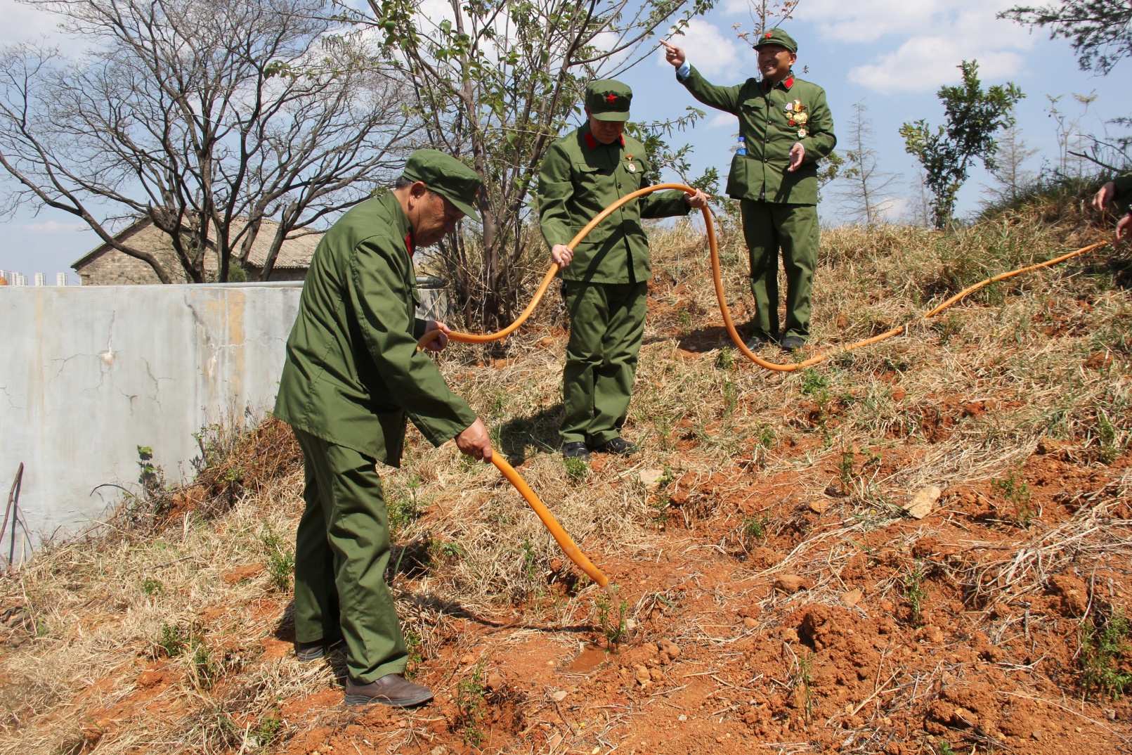 老兵们找来水管等工具,在烈士陵园管理所负责人的帮助下,精心浇灌在植树节亲手栽植的迎春花。