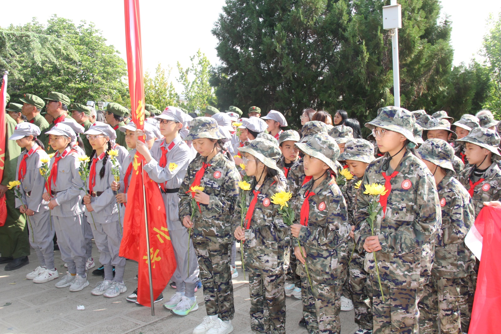 现场庄严肃穆,全体人员和少先队员向王德三纪念碑献花束