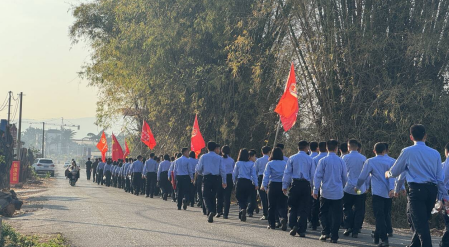 清晨6时50分时,师生齐聚升旗广场,校领导强调活动秩序与安全要求后,队伍于7时整迎着晨光整装出发!一路上,师生们高唱红色赞歌,歌声嘹亮、步伐铿锵,以昂扬的精神风貌向着烈士陵园前行。全程往返11公里,全体师生无一人掉队、无一人退缩,用坚持诠释青春担当。为筑牢出行安全防线,学校精心部署,应急救护人员全程跟队守护,移动保障车辆沿途待命,用细致保障为活动保驾护航。