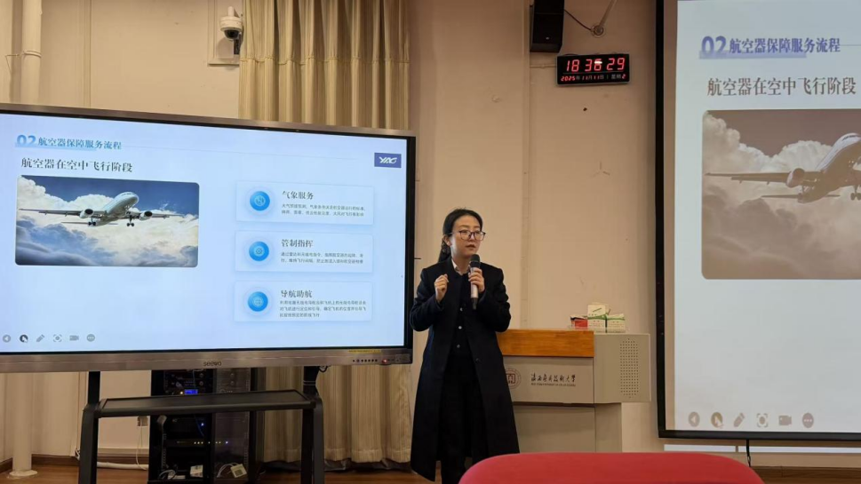 随后,主讲人深入解析航空器全流程保障服务体系,涵盖空中飞行阶段的气象保障、交通管制、导航引导,以及地面运行中的航空器引导、维护检修、燃油加注、机上配餐等核心环节,同时梳理了值机办理、安全检查、候机登机、行李提取等旅客服务全链条,让学生对行业服务流程建立起全面立体的认知。