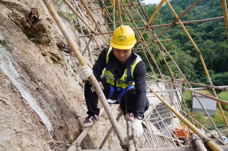 攀爬、清理危岩、钻孔、安装锚杆…每一个动作,都需在陡峭的斜坡上完成,每一步都必须在高度集中精神下进行。