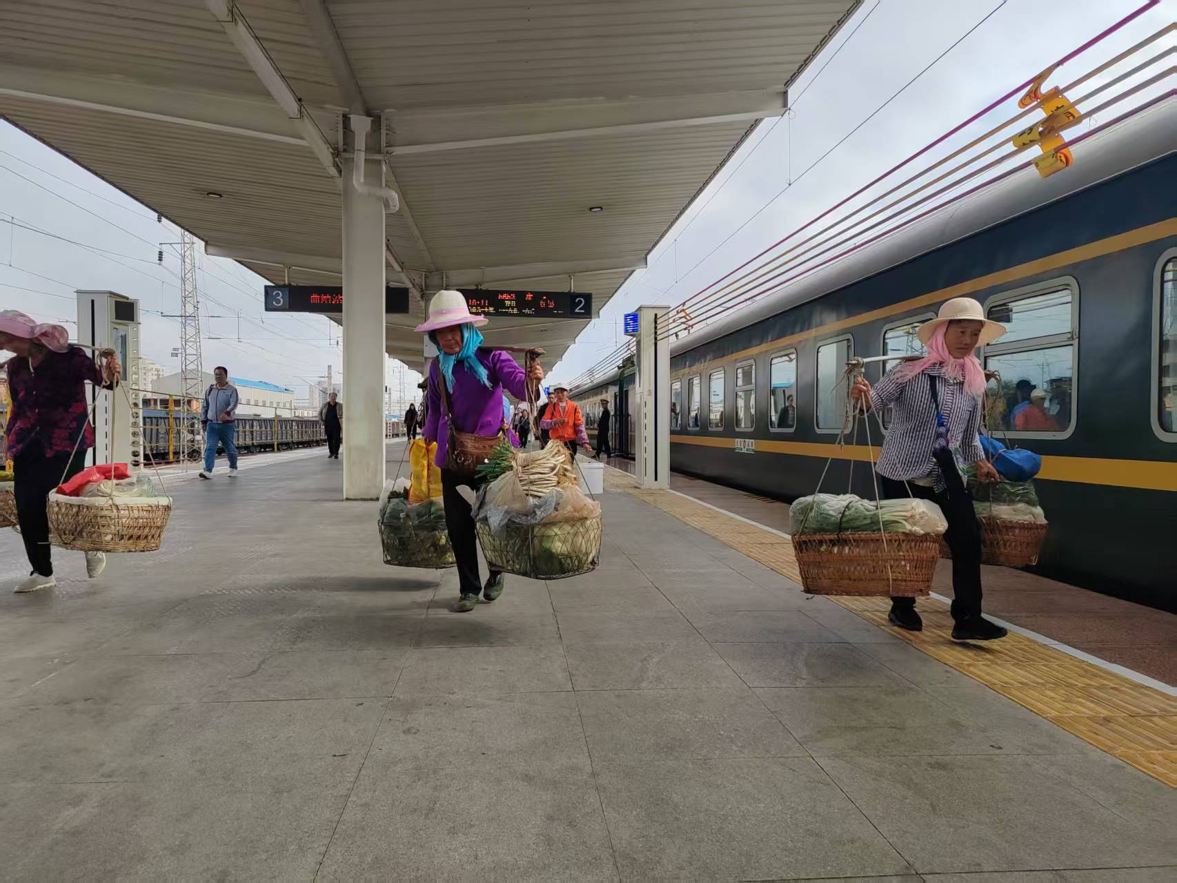 果不其然,9时22分,列车在吴官田车站停妥后,十多个菜农挑着扁担、背着箩筐早已在站台上等候。在车站和列车工作人员的有序组织下,不到3分钟,所有箩筐和扁担全部有序摆放到位,一时间,车厢里变得热闹起来。在列车过道里,番茄、扁豆、茄子、辣椒、白菜、蒜苗等时令蔬菜琳琅满目,还有苹果、梨等水果和云南夏秋季节特色山珍野生菌。列车再次启动,此起彼伏的吆喝声、讲价声、微信支付提示音已悄然响起,给车厢增添了一股“菜市场”的气息。