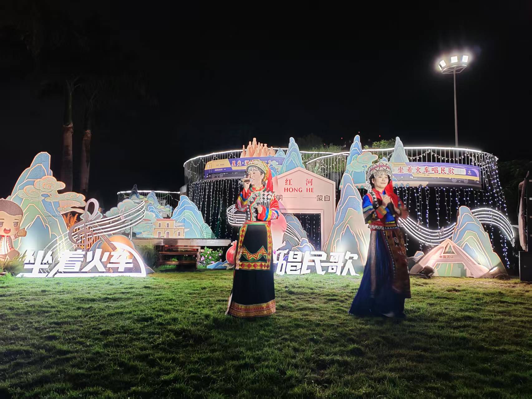 11月18日20时许,在云南省蒙自市南湖边,随着红河州民族歌手李怀秀、李怀福的一首铿锵民族经典歌曲《金鸟银鸟飞起来》唱响,由云南省文化和旅游厅、中国铁路昆明局集团有限公司(下称“国铁昆明局”)、红河州政府联合举办的“坐着火车唱民歌”文旅主题宣传推广在蒙自开展,来自云南各州(市)的数十名歌唱演员,通过“一首民歌、一位歌手、一个推介”的方式,向公众推荐“坐着火车游云南”精品线路和特色旅居目的地。