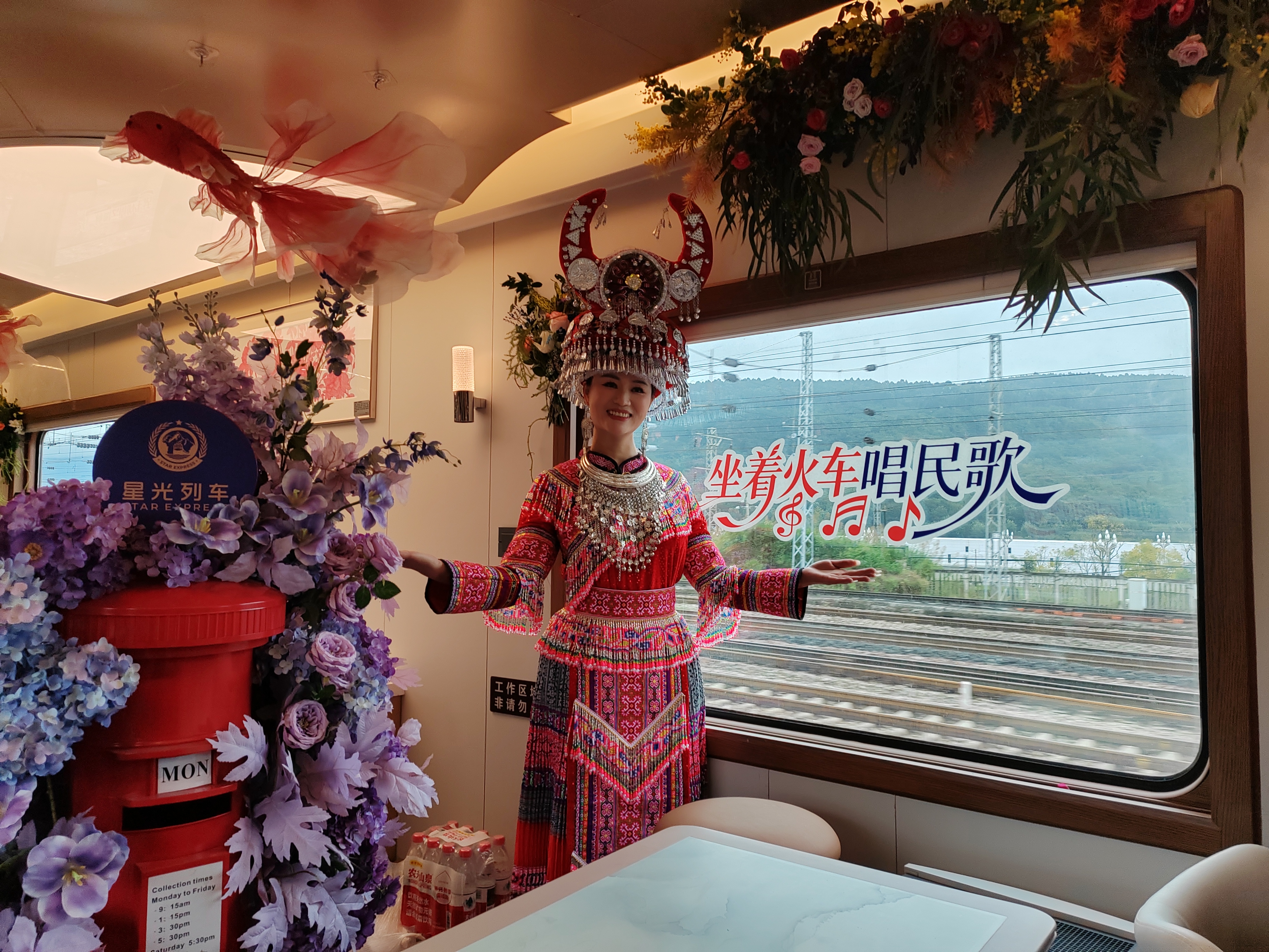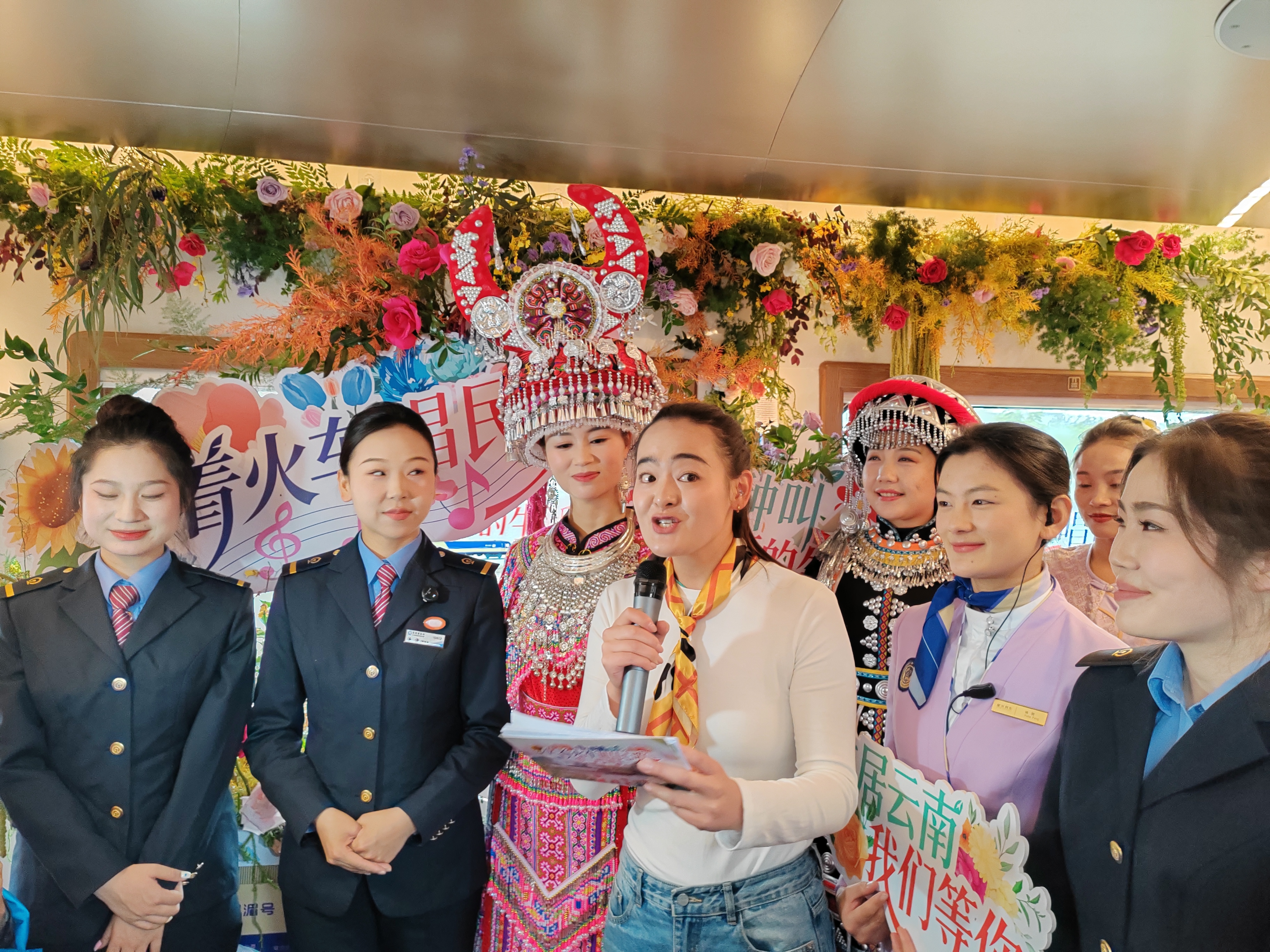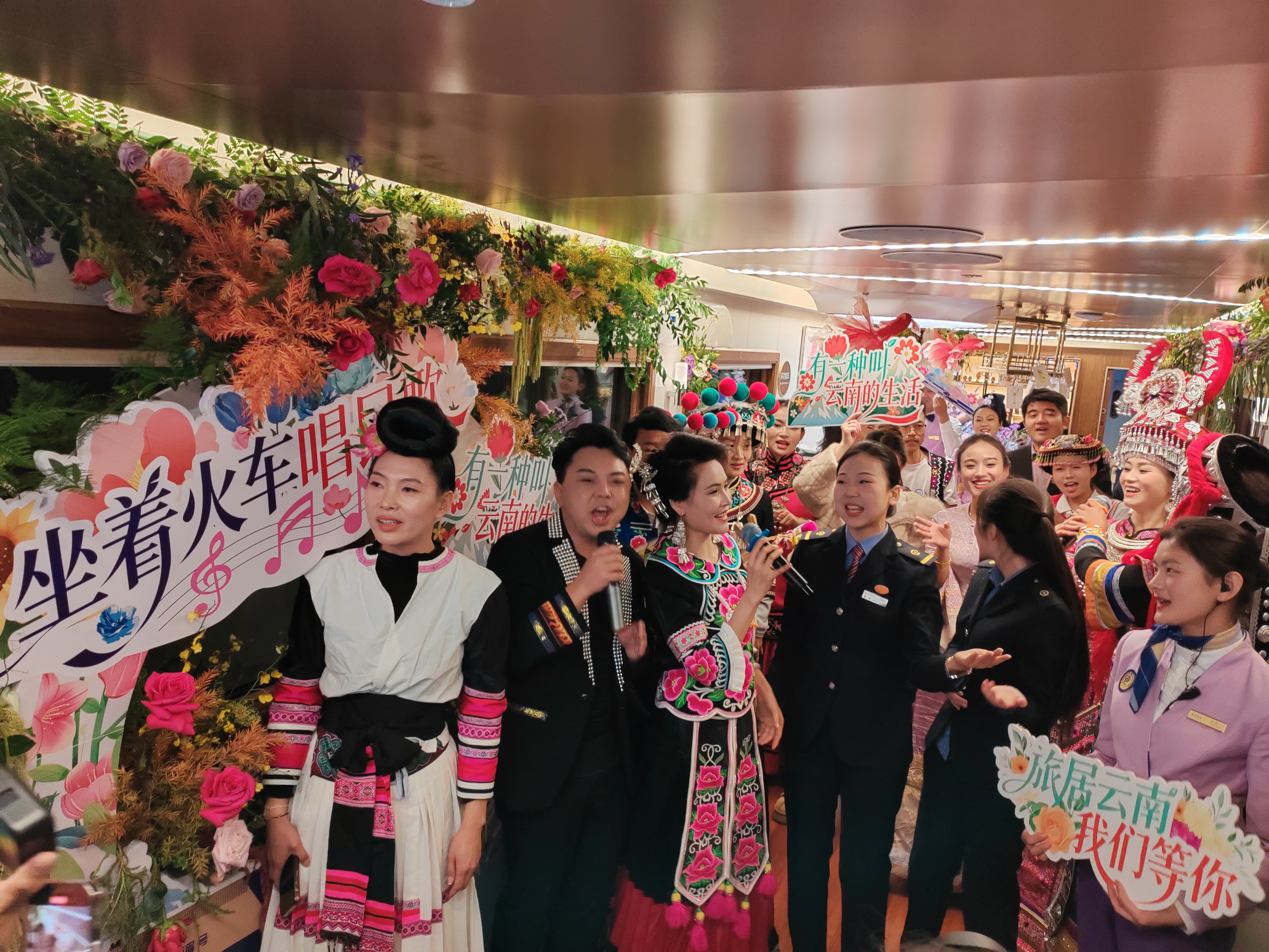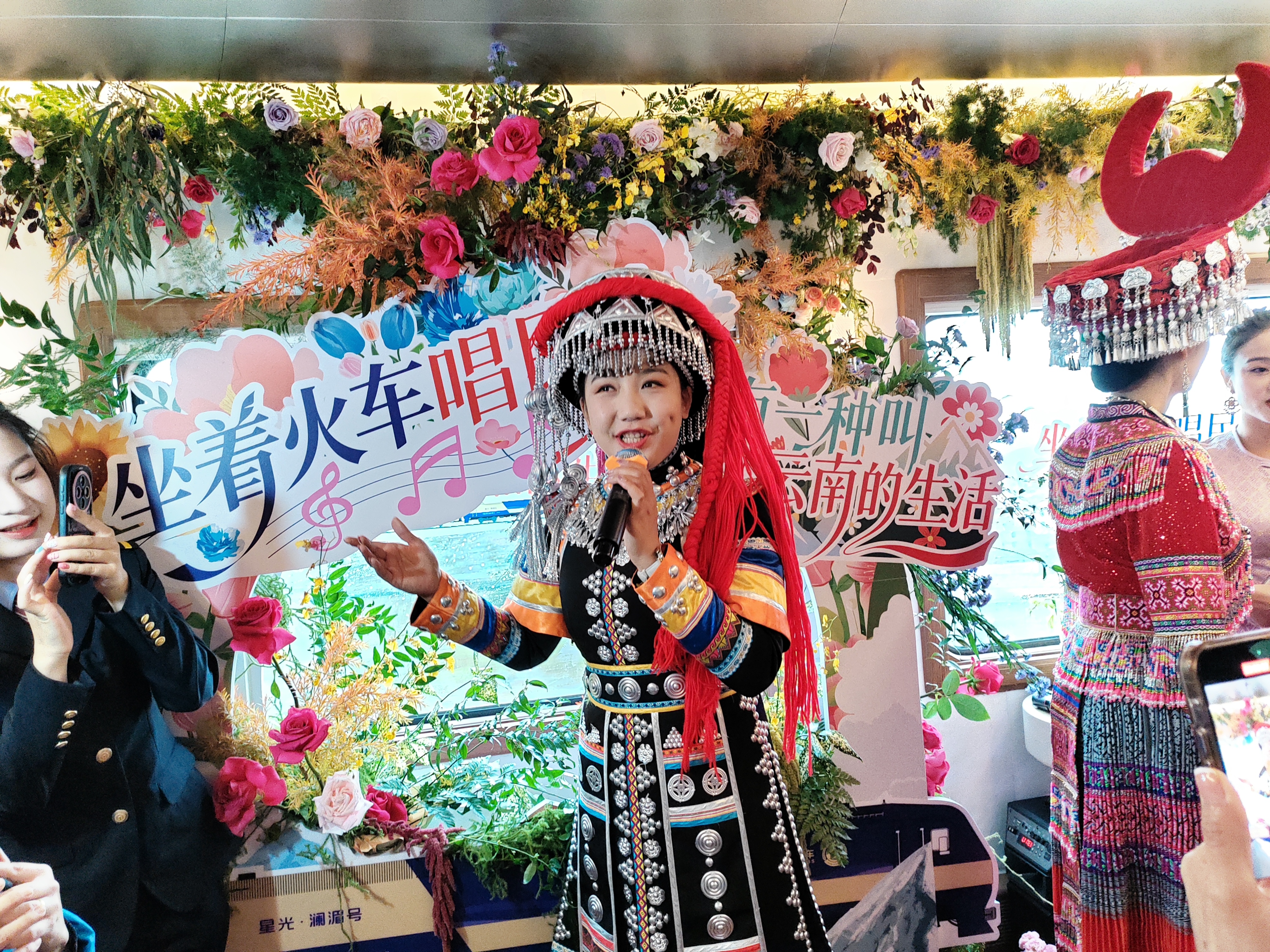国铁昆明局经营开发部相关负责人介绍,此次在列车上开展“坐着火车唱民歌”文旅主题推广,是深化“铁路+文旅+民歌”融合发展的新尝试,我们对车厢进行了云南民族特色元素妆点,意在通过场景塑造和内容创新,丰富旅客乘车体验,提升云南民族文化内涵和影响力,推动“云南民歌大家唱”,助力文旅市场“一路生花”。