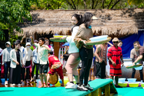 亮点1:传统仪式与多种民俗互动。节日从东门象脚鼓声中拉开序幕,傣族姑娘小伙身着盛装跳起欢快的嘎光舞,轻洒吉祥圣水迎接宾客。游客可跟随巡游队伍走进傣寨,参与古朴庄重的传统取水、祈福仪式,沉浸式感受原汁原味的傣族文化。德昂寨浇花节仪式温情浓郁;哈尼寨广场玩水夺标欢腾喜庆,背新娘运水、竹竿舞运水、独轮车运水等竞技趣味不断。