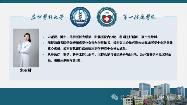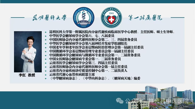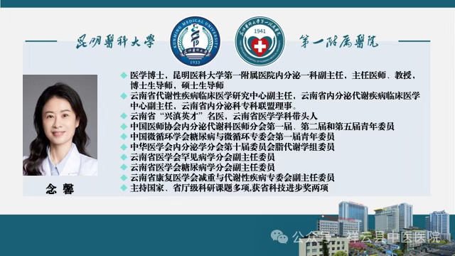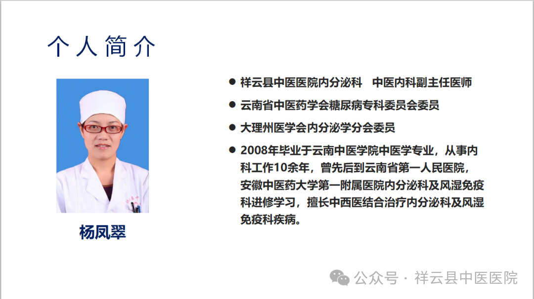 3.内分泌科简介祥云县中医医院内分泌科成立于2015年10月,是以中西医结合为特色的临床科室。科室现有医护人员 25人(医生 11 人,护士 14 人), 其中主任医师1人,副主任医师2人,主治医师 4人,医师 4人,其中中医专业医生 7 人, 西医医生 4人,中西医比例为 7:4,其中2人为研究生学历,9人为本科学历。副主任护师 1 人,主管护师2人,护师7人,护士4人。其中 13人本科,1人为专科学历。科室人员结构合理,技术力量雄厚。科室大部分医护人员有四川华西医院、广州中医药大学、昆明医科大学第一附属医院、云南省第二人民医院、云南省中医院等三甲医院进修学习经历。科室目前拥有胰岛素泵、动态血糖监测、眼底镜、院内外血糖管理系统及各种中西医先进诊疗设备。目前主要开展糖尿病( 糖尿病视网膜病变、胃轻瘫、糖尿病胃肠自主神经病变、糖尿病周围神经病变、糖尿病足、糖尿病酮症酸中毒、糖尿病合并各种感染)、代谢性疾病(高尿酸血症、痛风、血脂异常)、骨质疏松症、甲状腺疾病(甲状腺功能亢进症、甲状腺功能减退症、甲状腺炎、甲状腺结节)、甲状旁腺疾病、内分泌性高血压、风湿免疫疾病(类风湿性关节炎)等多种疾病的诊治工作。科室通过先进的现代医学诊疗技术,结合传统中药汤剂口服及中医针刺、艾灸、穴位贴敷、中药薰洗、穴位注射、刮痧等中医治疗技术,对上述疾病疗效显著。科室在各型糖尿病及并发症的诊疗上具有独特的治疗经验,赢得了广大患者的信任和良好的口碑。科室始终秉承“病人至上、仁爱为本”的院训,不断提高科室自身能力,更好的为患者提供优质的诊疗服务!
