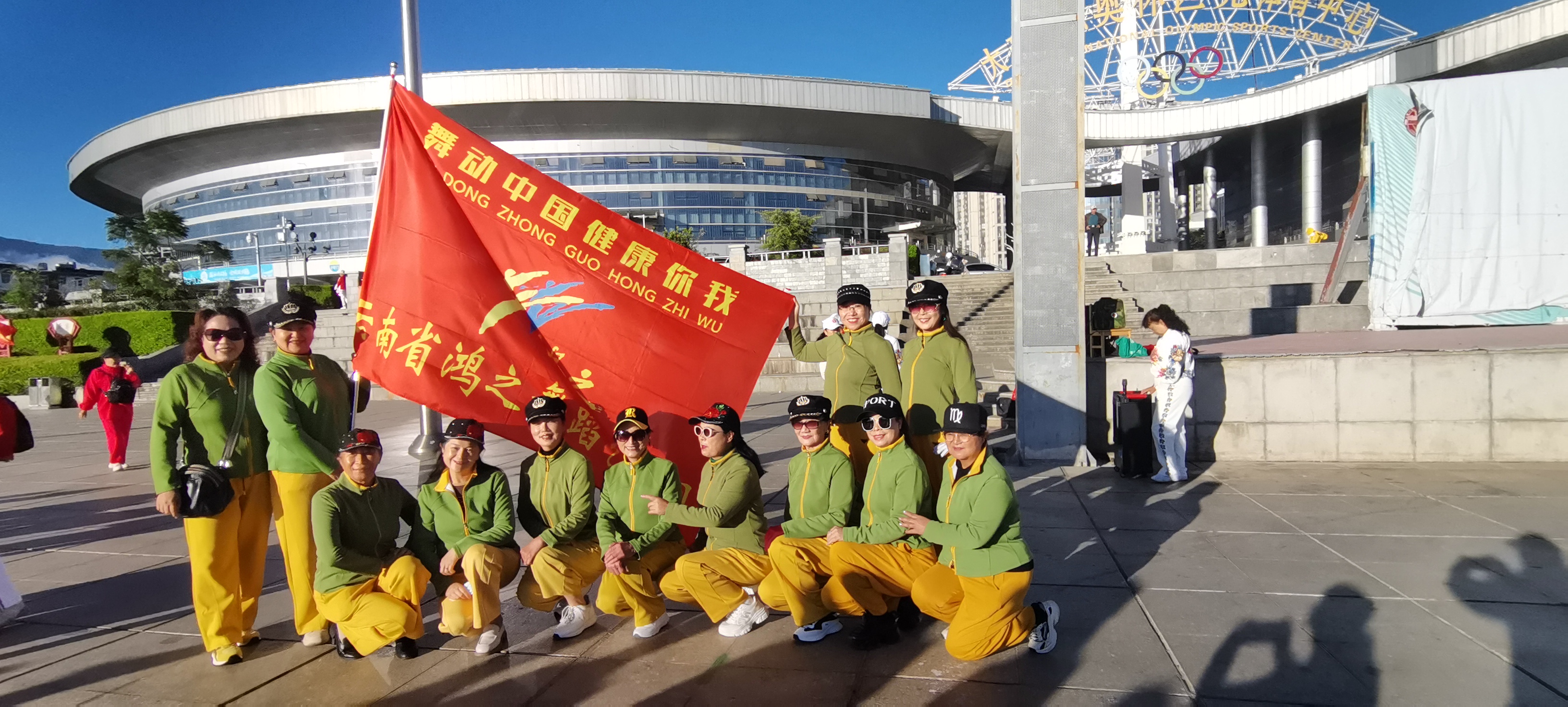 大理州州直老体协副主席杨泽英宣布了今天健步走活动的顺序是1.门球分会、2.太极拳剑分会、3.健身球分会、4.艺术团分会、5.水兵舞队、6.乒乓球分会、7.瑜伽分会、8.棋牌分会、9.点苍山武术分会、10.地掷球分会、11.陈氏太极拳队、12.卓玛锅庄舞团。活动进行到第四项议程照集体照,于是在舞台旁的南边台阶上,大家拉开条幅,兴高采烈地的集中进行合影留念。随着主持人宣布“健步走活动准备开始”的口令后,各分会依次在广场按照次序进行了排队,长长的队伍犹如一条蛟龙,在州直老体协顾问杨泽兵老领导的一声“健步走活动开始!”