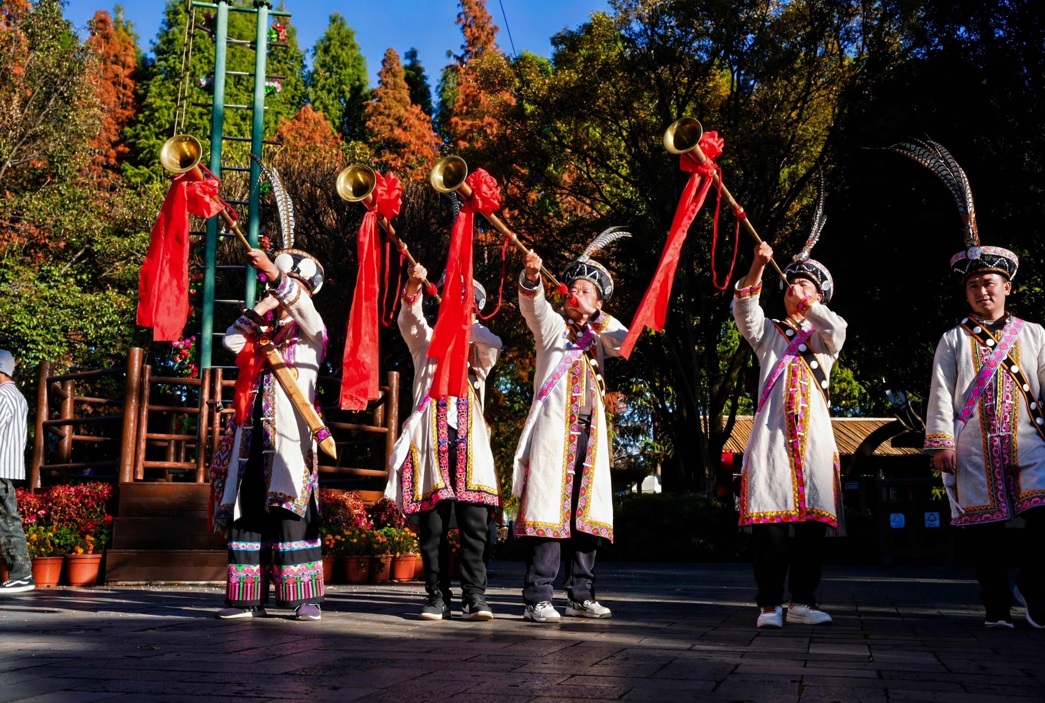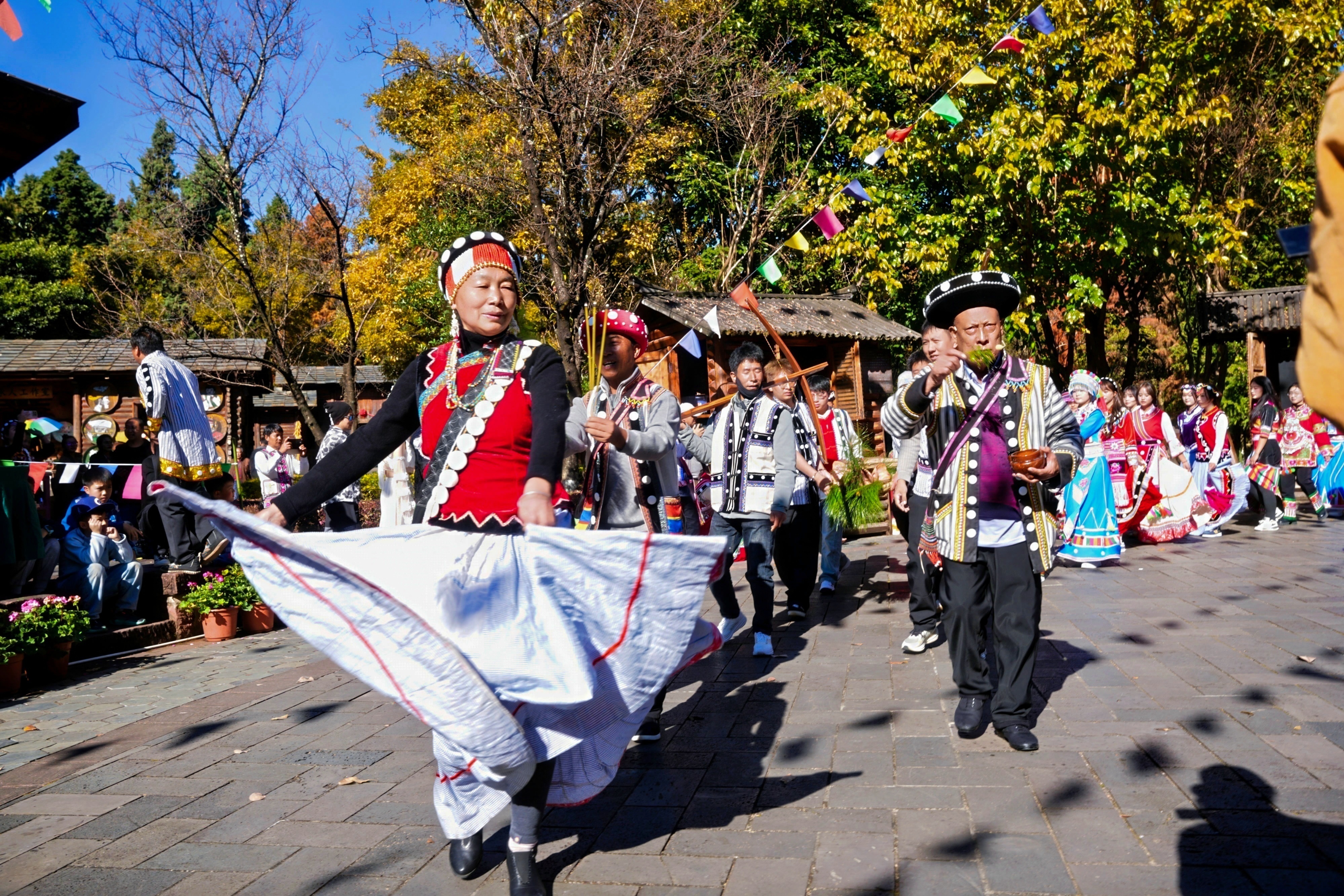 活动当天,云南民族村刀杆广场彩旗飘扬、鼓乐喧天,浓厚的民族风情扑面而来。节日活动以一场庄重古朴的祈福仪式拉开节日帷幕,以祈来年国泰民安、安康顺遂,传递对美好生活的热切向往。在广场上演了傈僳族民间非遗绝技“上刀山”,傈僳勇士尽显峡谷民族坚韧精神,并为现场幸运游客送上祝福,赢得阵阵欢呼与热烈掌声。