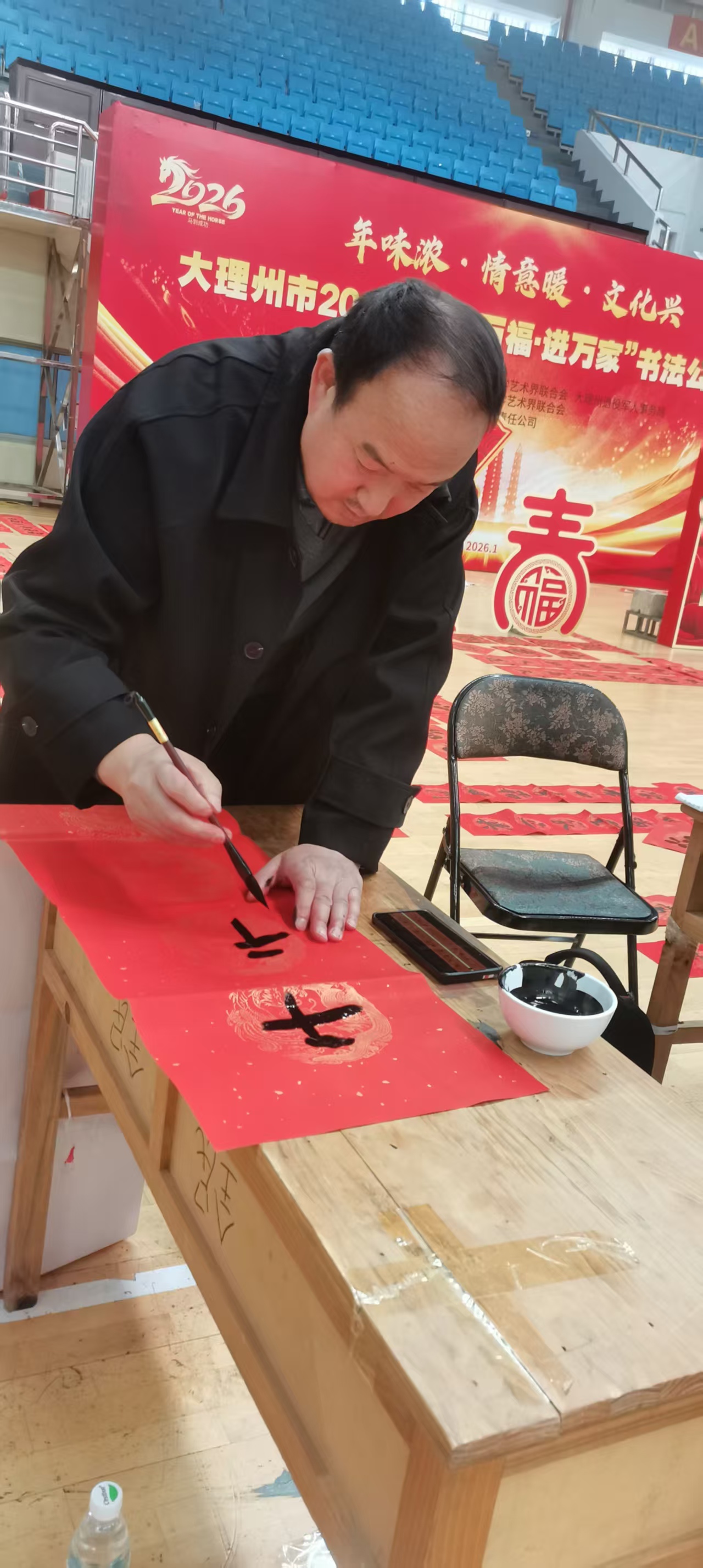 为弘扬中华优秀传统文化,丰富大理民族地区群众精神文化生活,营造欢乐祥和的节日氛围,让广大市民度过一个祥和喜庆、充满文化韵味的 2026 年春节。1月30日下午,由云南省大理州退役军人事务局、大理州总工会、大理州文学艺术界联合会、大理市总工会、大理市文学艺术界联合会联合主办,大理市教育建设投资有限责任公司协办的“年味浓、情意嗳、文化兴”----大理州市2026年“送万福・进万家”书法公益活动在大理全民健身中心室内篮球场圆满落下帷幕。