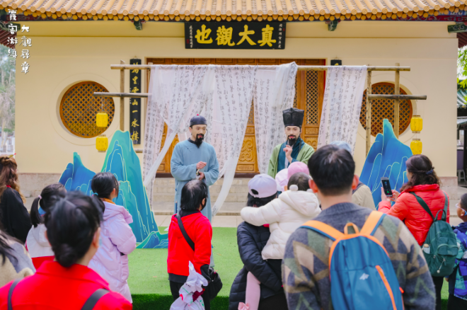 项目彻底跳脱了传统观光模式,将大观公园近华浦核心区精心打造为一个庞大的开放式实景剧场。孙髯翁长联、催耕馆、揽胜阁等真实景物,不再是孤立的观赏点,而是被有机编织进剧情线索网络。游客手持定制“寻章路引”,在真实的亭台楼阁、碑刻楹联间穿梭,通过观察、推理和问答,一步步拼凑起徐霞客当年的游历图景。