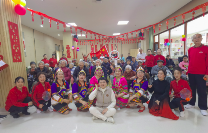 作为一心堂药业集团旗下专注老年健康的子公司,一心医养依托二级医院医疗支撑,构建起“机构—社区—居家”三级联动服务体系。本次活动将新春年俗与医养关怀深度融合:院内长者自编新疆舞展现银发活力,护理人员全程伴护随时响应健康需求,而柔力球队的来访则形成白发对白发的精神共鸣。