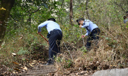 4月1日上午9时,18名民警携带扫帚、镰刀等工具,沿黑山门战斗遗址200米栈道开展环境清理。民警们俯身铲除石缝杂草、清扫枯枝落叶,仔细擦拭纪念碑底座青苔。经过1小时劳动,栈道重现整洁。