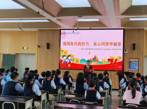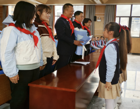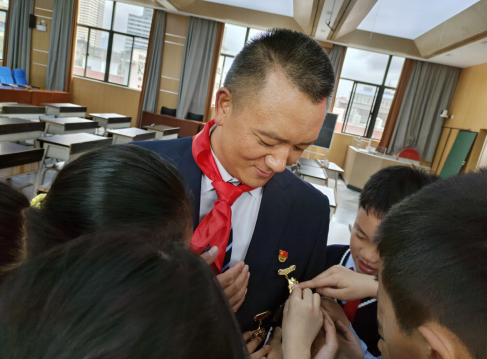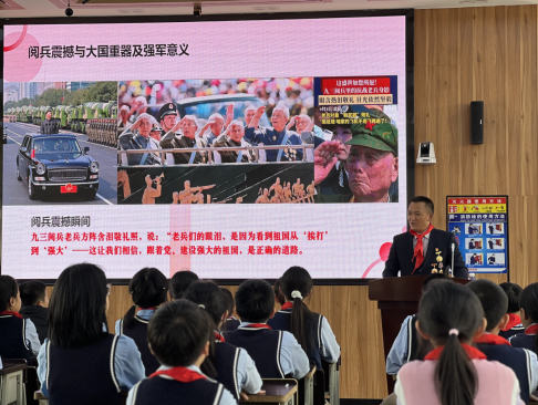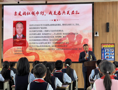 关君孔同志曾在部队保家卫国,将宝贵的青春与滚烫的热血毫无保留地奉献给了国家安全和人民幸福。讲座伊始,少先队员代表满怀敬意地为关君孔同志佩戴上鲜艳的红领巾,并献上芬芳的鲜花,表达对关君孔同志的崇高敬意。讲座中,关君孔同志结合自身经历,用质朴而真挚的语言,讲述了一段段激情燃烧的故事,让同学们深刻感受到军人的责任与担当,以及爱国精神的强大力量。现场互动环节气氛热烈,同学们积极踊跃提问,关君孔同志耐心细致地解答,进一步拉近了与同学们的距离。