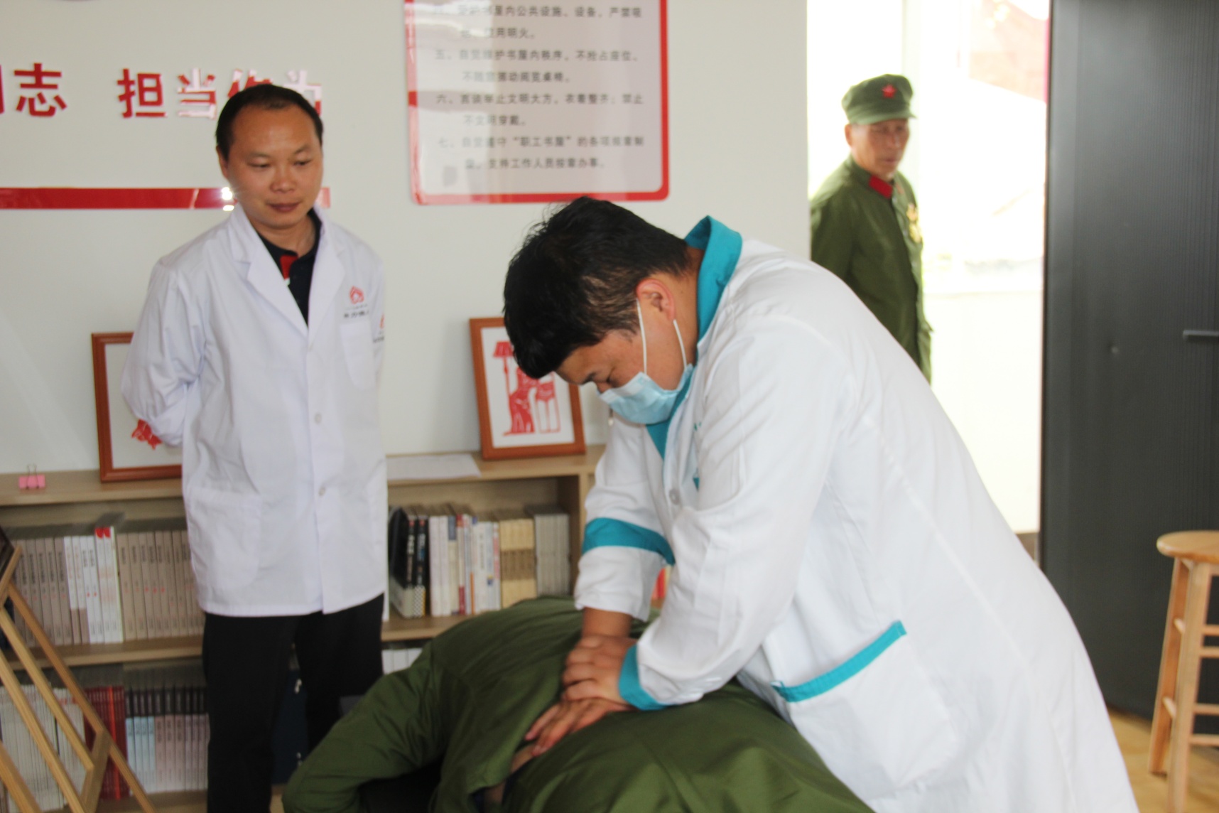 社区活动现场气氛热烈且温馨,闻讯而来的老兵聚集在会议室,聆听健康知识讲座,进行健康体检和感受推拿等治疗。