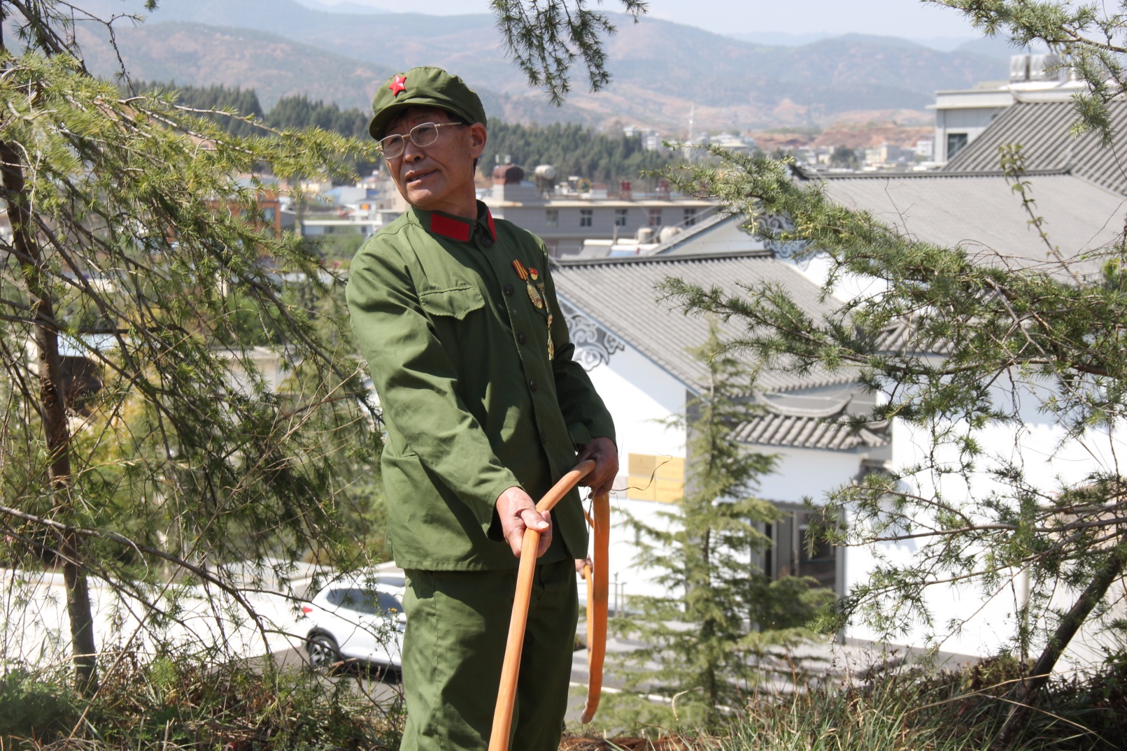 到祥云烈士陵园参加清明节祭扫烈士陵园活动的退役军人代表,在活动之余自发组成老兵志愿服务队,利用参加活动的间隙,自觉自愿开展呵护花草树木行动。
