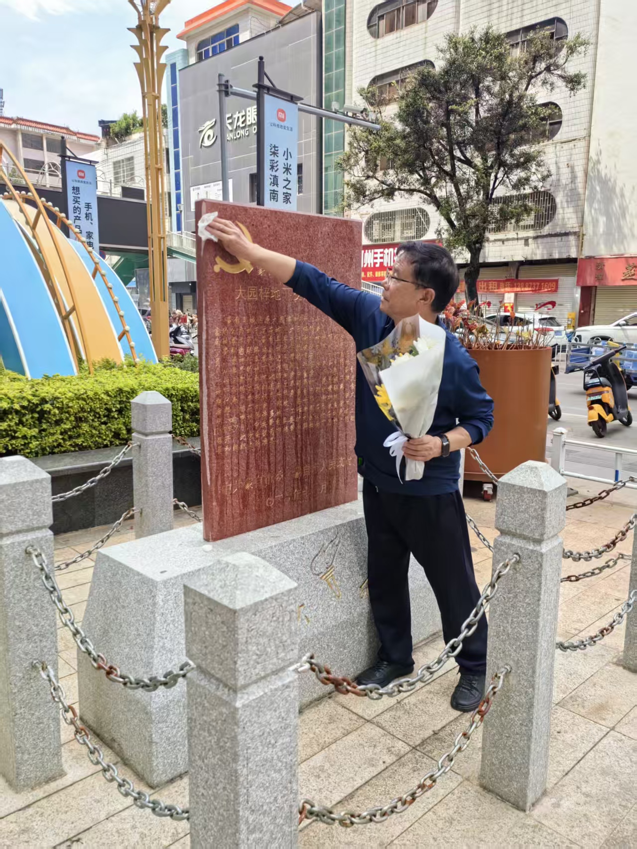 在现场,刘东立神情肃穆,首先认真擦拭革命纪念碑上的尘埃,细致清理碑身杂物,让纪念碑重现整洁庄严的面貌。随后,他郑重地向纪念碑敬献鲜花,静静肃立默哀,深切缅怀为革命事业英勇奋斗、无私奉献的先辈们。