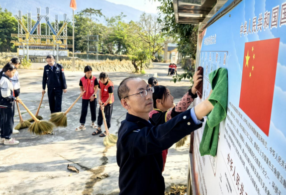 下午16时,活动广场上党旗飘扬。民警与小学生分组协作,擦拭宣传栏、清扫落叶、清理卫生死角,向学生普及垃圾分类知识。民警手把手教孩子们使用清洁工具,小学生们则用画笔在广场文化墙绘出“雷锋故事”。经过两小时劳动,广场焕然一新,村民纷纷点赞。