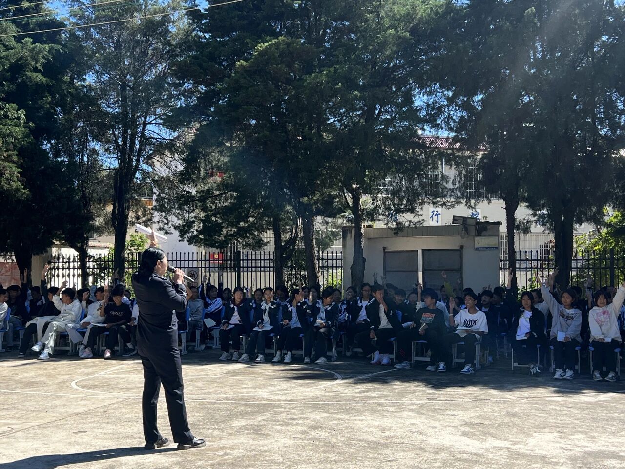活动由德育办主任吴润五主持,179名学生及在校老师参加。活动中,杨金美主任结合青少年身心发展特点和校园生活实际,避开枯燥的法律条文堆砌,转而以“身边事”讲“身边法”,通过选取校园欺凌、网络诈骗、防性侵等典型案例,用通俗易懂的语言剖析案件背后的法律逻辑。
