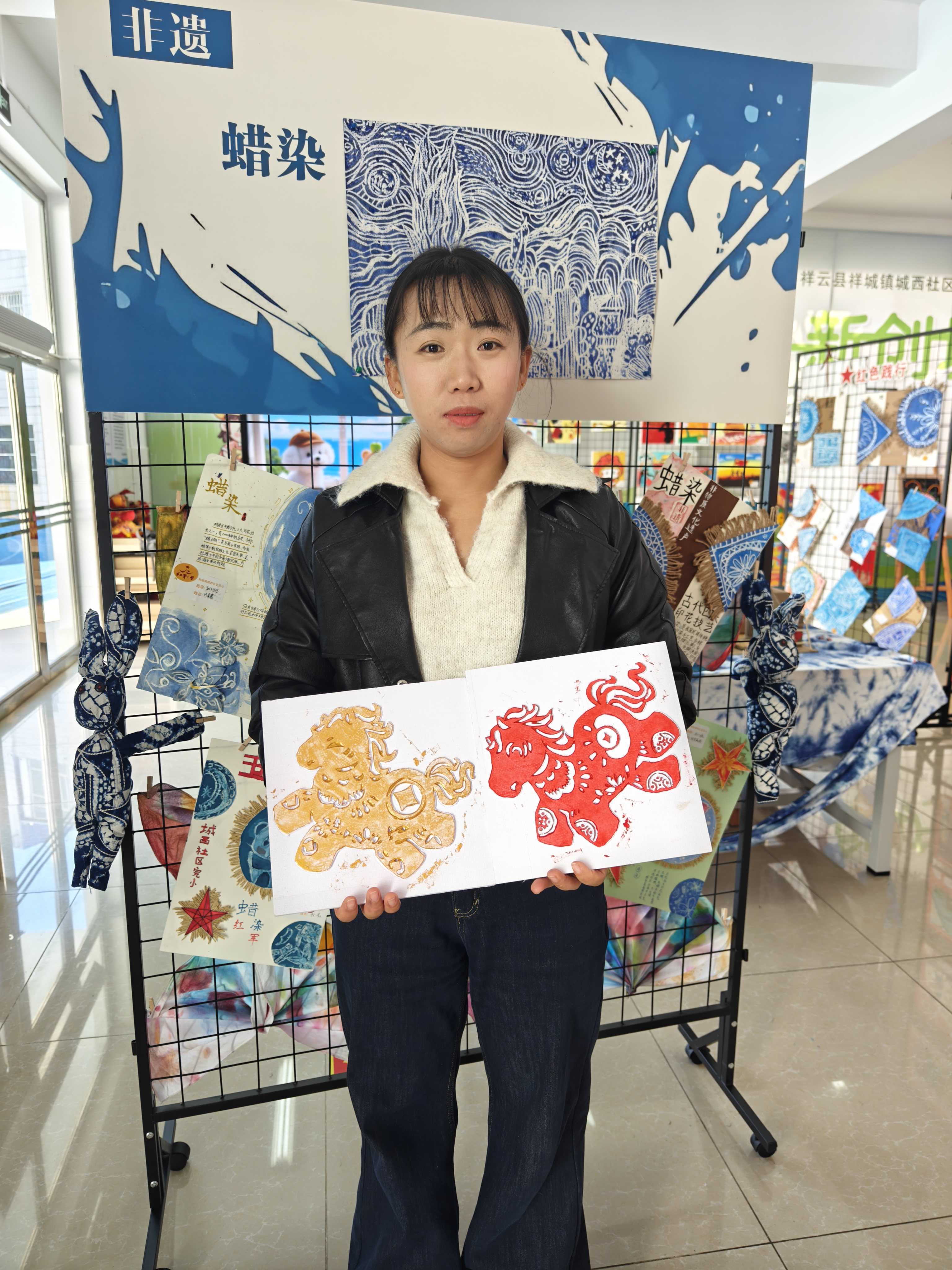 展览现场,一幅幅主题鲜明的绘画作品、一件件巧思独具的手工作品整齐陈列。红色主题板块中,孩子们以画笔勾勒革命先烈的英勇身姿、描绘祖国山河的壮丽图景,用稚嫩的笔触诉说对革命精神的崇敬;非遗传承板块里,扎染、泥塑、京剧脸谱、剪纸等作品琳琅满目,孩子们在动手实践中感受传统技艺的魅力,沉浸式体验物质文化遗产的独特韵味。