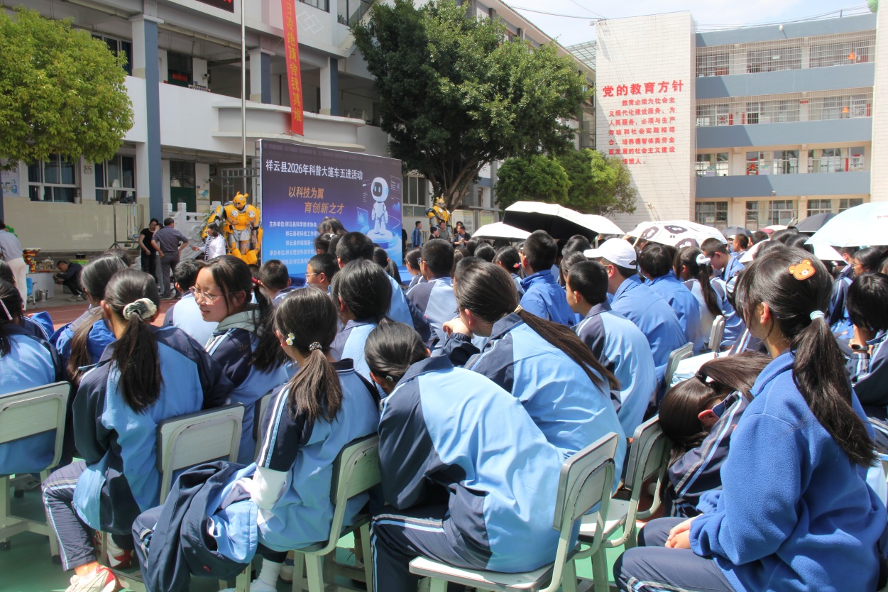 为进一步落实“双减”政策,丰富校园科技文化生活,激发青少年学科学、爱科学、用科学的浓厚兴趣,由祥云县科学技术协会、祥云县老科技工作者协会、祥城镇第一初级中学主办,祥云县悟空科技学校、大理智界科技有限公司承办的祥云县2026科普大篷车五进活动,在祥城镇第一初级中学拉开序幕。