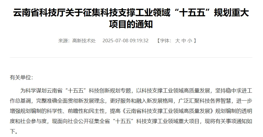 云南省科技厅关于征集科技支撑工业领域“十五五”规划重大项目的通知(2025.7.9)云南省科技厅关于2025年度云南省科学技术奖提名受理情况的公示(2025.7.17