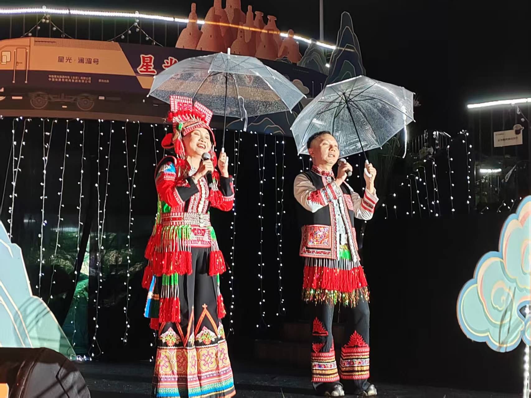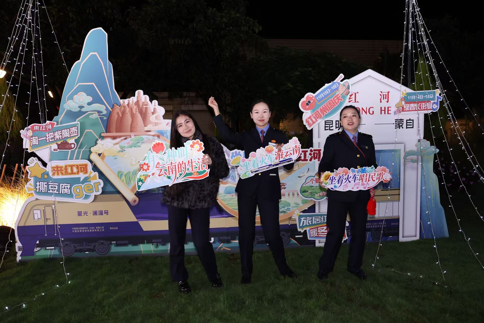 11月18日20时许,在云南省蒙自市南湖边,随着红河州民族歌手李怀秀、李怀福的一首铿锵民族经典歌曲《金鸟银鸟飞起来》唱响,由云南省文化和旅游厅、中国铁路昆明局集团有限公司(下称“国铁昆明局”)、红河州政府联合举办的“坐着火车唱民歌”文旅主题宣传推广在蒙自开展,来自云南各州(市)的数十名歌唱演员,通过“一首民歌、一位歌手、一个推介”的方式,向公众推荐“坐着火车游云南”精品线路和特色旅居目的地。