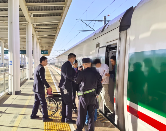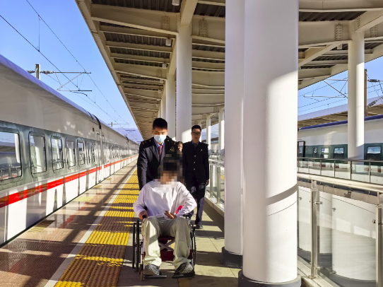 9时10分,列车准点抵站。朱柏吉与列车长快速完成交接,精准掌握旅客病情。此时,患者腹痛如绞,双手紧捂小腹,冷汗浸满额头。朱柏吉与同事迅速将旅客扶上轮椅,平稳推送至站台外,无缝对接赶来的120救护车。众人合力将旅客转移至担架,医护人员当即按压患者后腰实施急救,疼痛得到有效缓解。